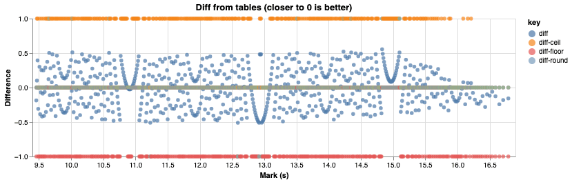 Because of that discrepancy, I tried ceil, floor, and round to see which would produce the most accurate measurements: